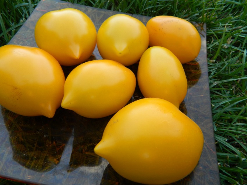 Плоды созревают медленно, постепенно краснея снизу. Полная спелость наступает тогда, когда помидор весь становится красным. Некрупные грушевидные плоды имеют 4-5 внутренних семенных камер, плотную мякоть с минимумом сока и яркий кисло-сладкий вкус. Аромат томатов выраженный, приятный. Экспертная оценка – 4,9 из 5.