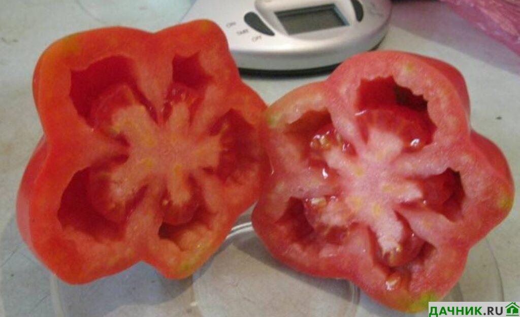 В силу такого строения спелый томат очень похож на болгарский перец, а в разрезе напоминает яркий кружевной цветок.