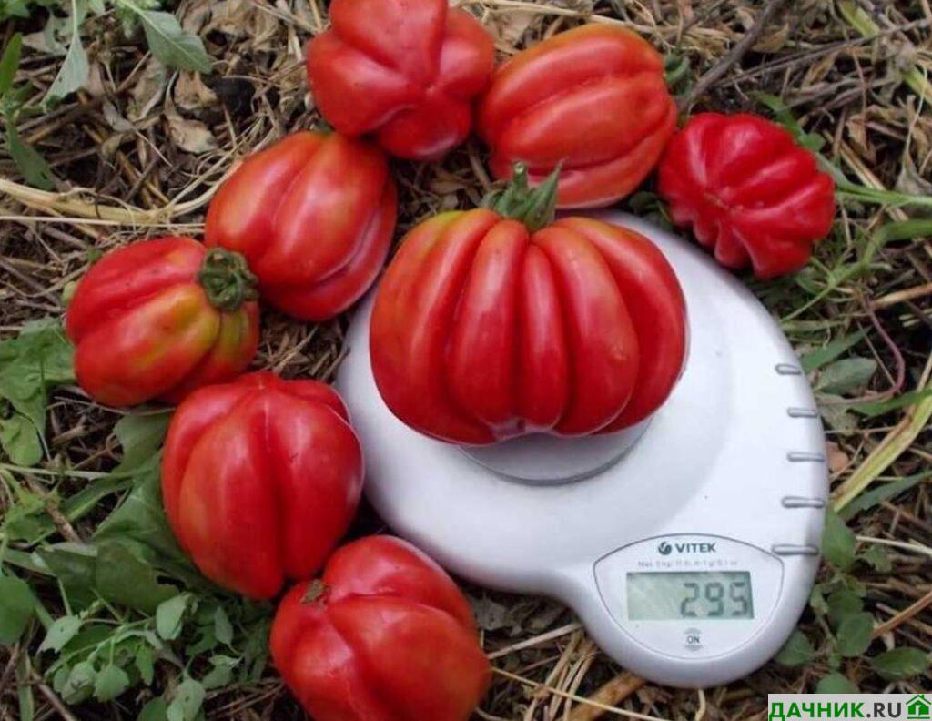 - Запоминающийся внешний вид: грушевидная, удлинённая, с отчётливой ребристостью форма, вершина напоминает болгарский перец. У каждого помидора количество рёбер разное;