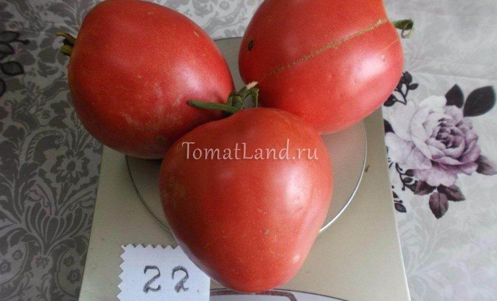 Плоды плоскоокруглые, чуть ребристые у плодоножки, в стадии зрелости насыщенного красного цвета, весом 250-500 грамм, мясистые, очень вкусные. Эти помидоры хороши для свежего потребления, приготовления соков, соусов.