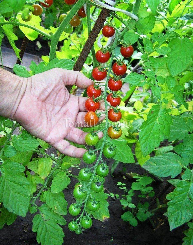 Размер помидоров также зависит от того, как сформирован куст (обычно в 2–4 стебля), чем больше стеблей — тем мельче помидорки. Мякоть плодов мясистая, красного цвета, вкусная и сочная, семян образуется мало. Кожица у помидорчиков плотная, устойчивая к растрескиванию.