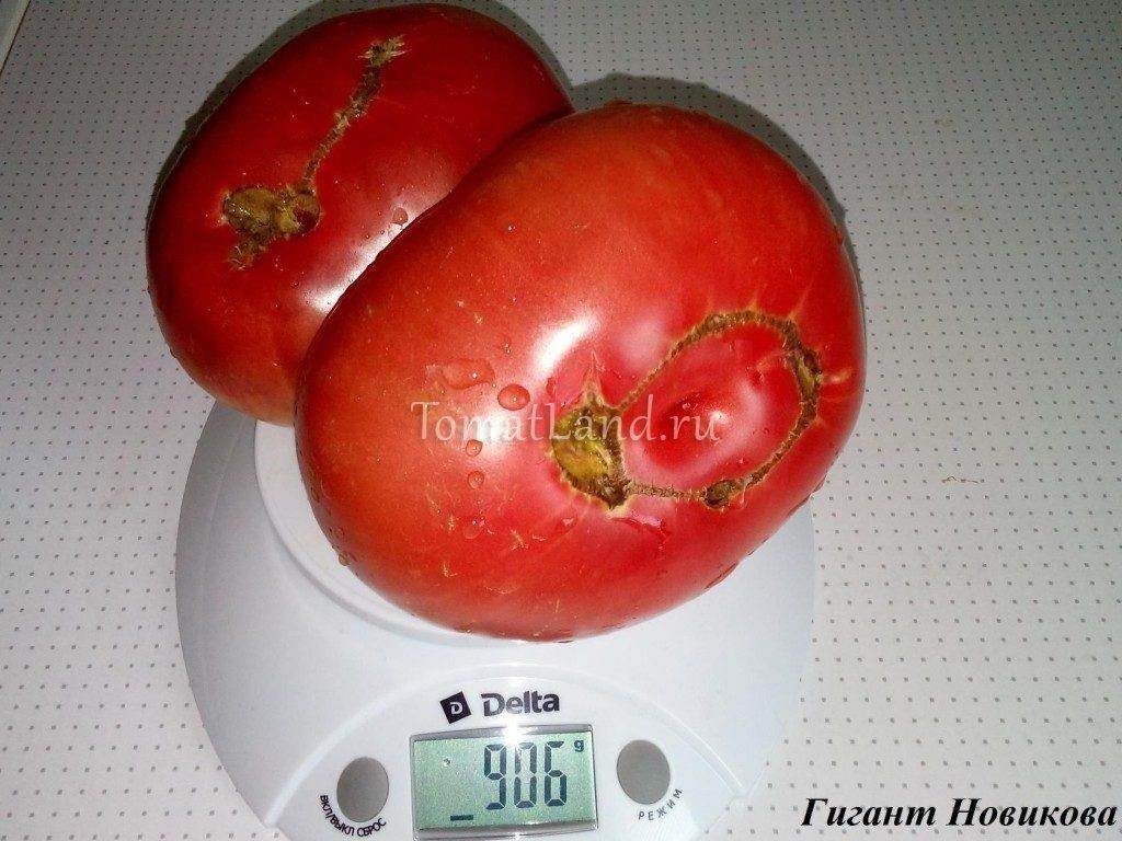 - Малиновый гигант. Спеет в среднем диапазоне времени до 90 дней. Плод весит более 500 г! С одного куста – 6 кг урожая. Сладковато-кислый вкус и рыхлость мякоти подходит для салатов. Необходимо использовать подвязки.
