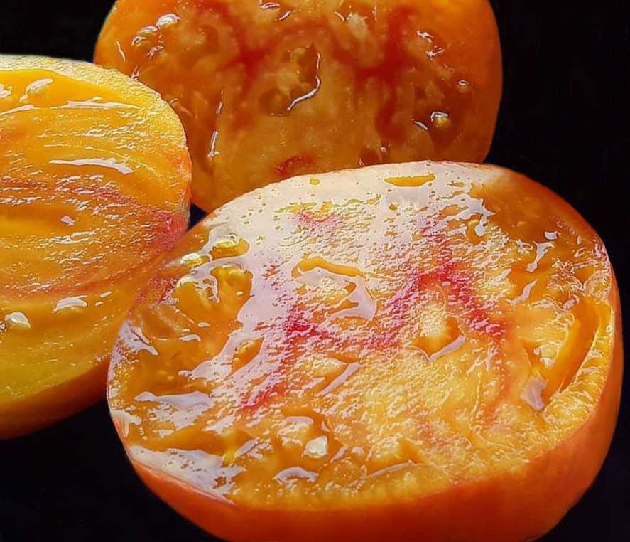 В разрезе помидор имеет ярко-розовый цвет, чем и напоминает одноименный фрукт.Камеры отсутствуют, малое количество семян.