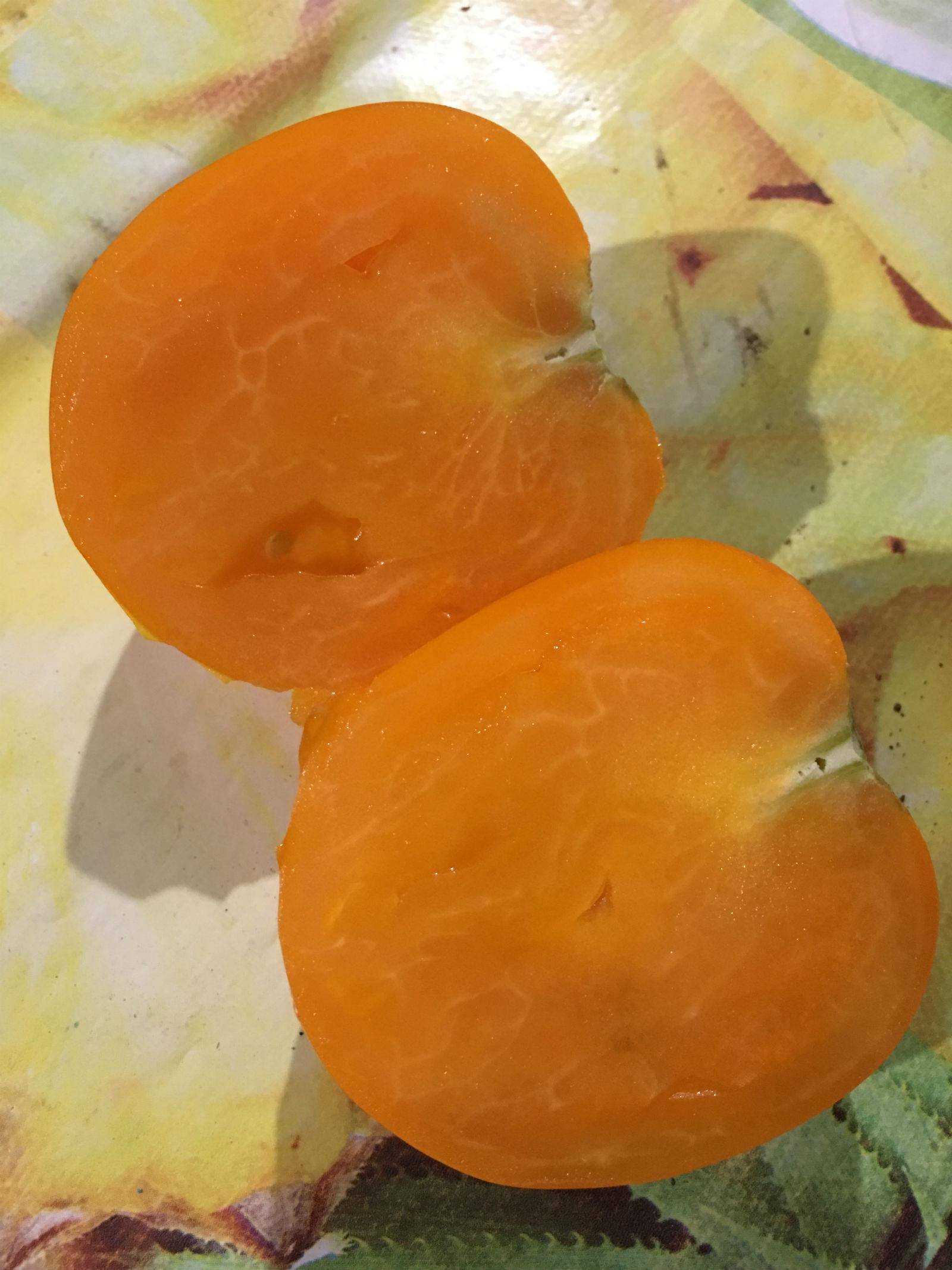 Внутренняя часть плодов имеет почти оранжевый окрас. В помидорах содержится более 5% сухого вещества, 3,5-4% сахаров. Томаты сохраняют свою форму даже при консервировании дольками.