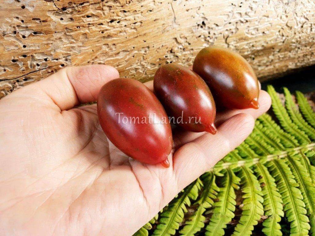На растении за сезон может образоваться 4-6 кистей на каждом стебле. Число завязей на кисти зависит от условий выращивания, но редко бывает менее 5 шт. Чаще всего кисти состоят из 7-10 одинаковых сливовидных плодов весом около 90-100 г. Такие грозди томатов могут покрывать все растение от верхушки до корня и делают плантацию декоративной.