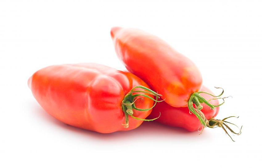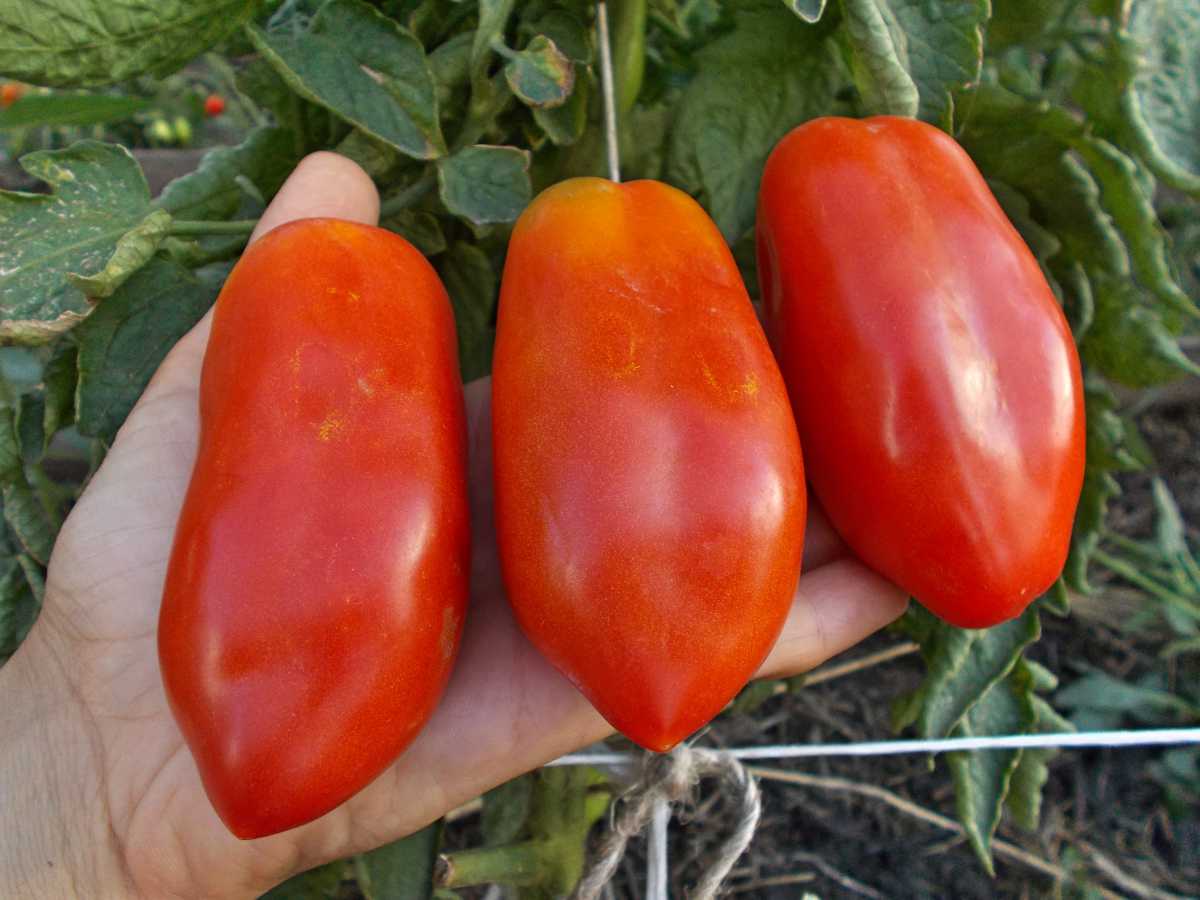 Плоды имеют странную для томатов форму. Они слишком вытянутые, внешне напоминают заостренную сигару длиной от восьми до десяти сантиметров – посмотрите на фото. Отдельные плоды иногда дорастают до пятнадцати сантиметров в длину. Итальянские помидоры весят от 100 до 150 пятидесяти граммов.
