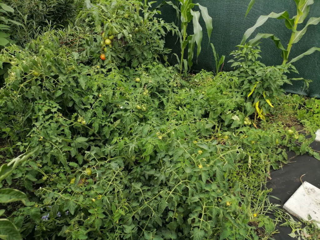 С ближнего края томат Катя, а возле кукурузы лежат 2 куста гибрида Полбиг