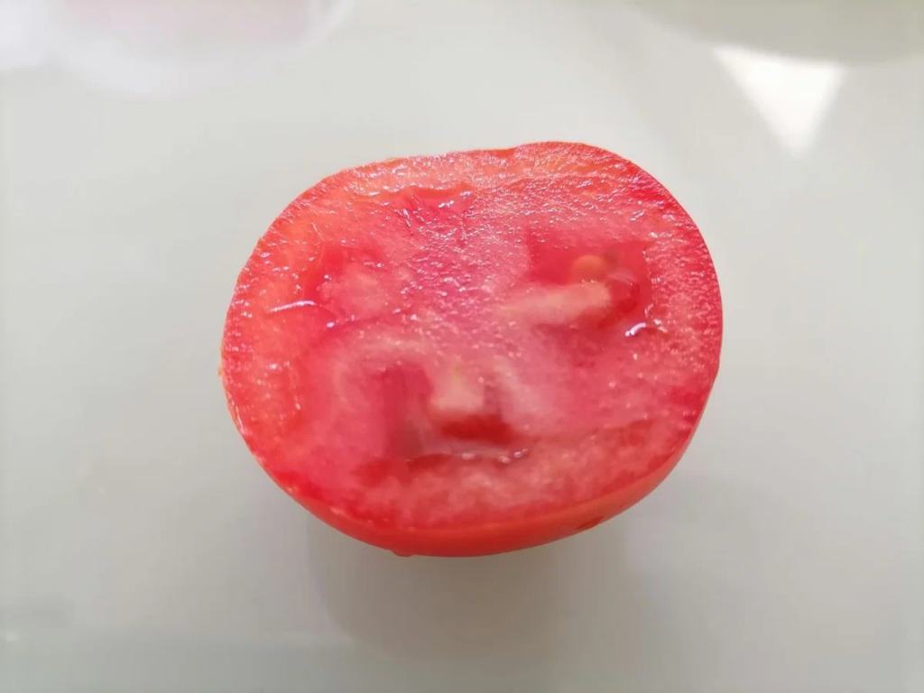 Помидор Полбиг в разрезе, много мякоти, она приятная, легко жуется с кожицей