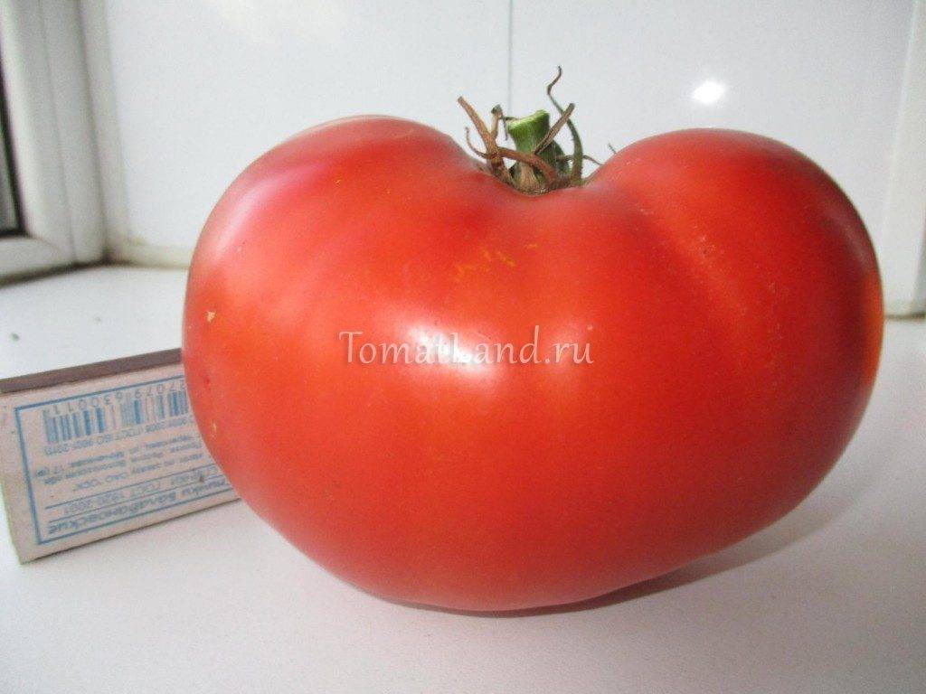 Плоды этого сорта округлые или слегка плоскоокруглые, при этом одно и то же растение может нести плоды разной формы. Крупность помидора в среднем 300-400 г, некоторые экземпляры доходят до 500 г.
