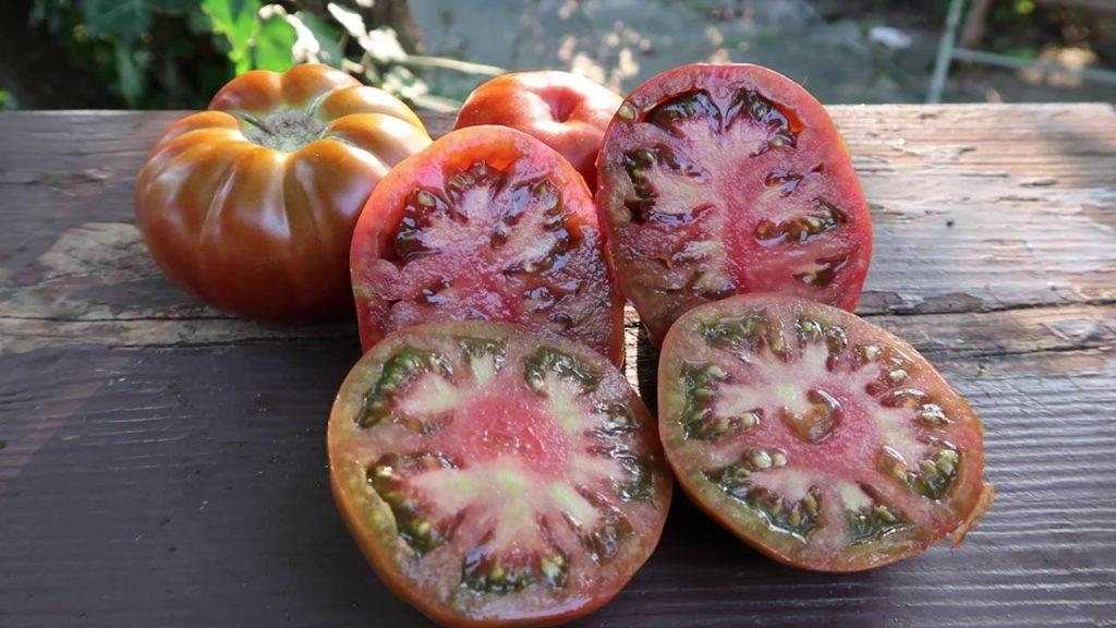 Среднеспелый индетерминантный сорт для открытого грунта и теплиц. Требует подвязки и формирования. Подходит для салатов. | Плоскоокруглый, сильноребристый, неплотный, коричневый, 150-250 г. Вкус хороший. |