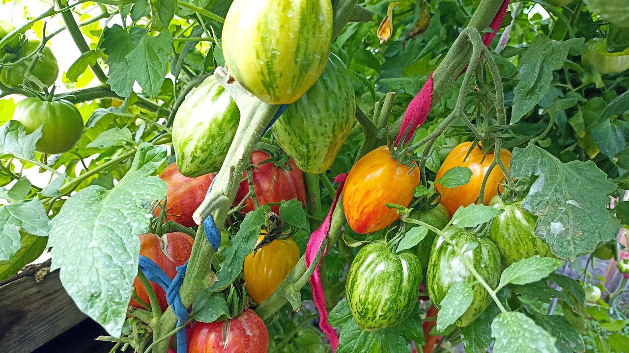Мощный индетерминантный сорт с красивейшими плодами: на терракотовом фоне оливковые полосы, мякоть цвета бордо. Вес плодов 200-250 гр. Сильное растение с обильным урожаем.