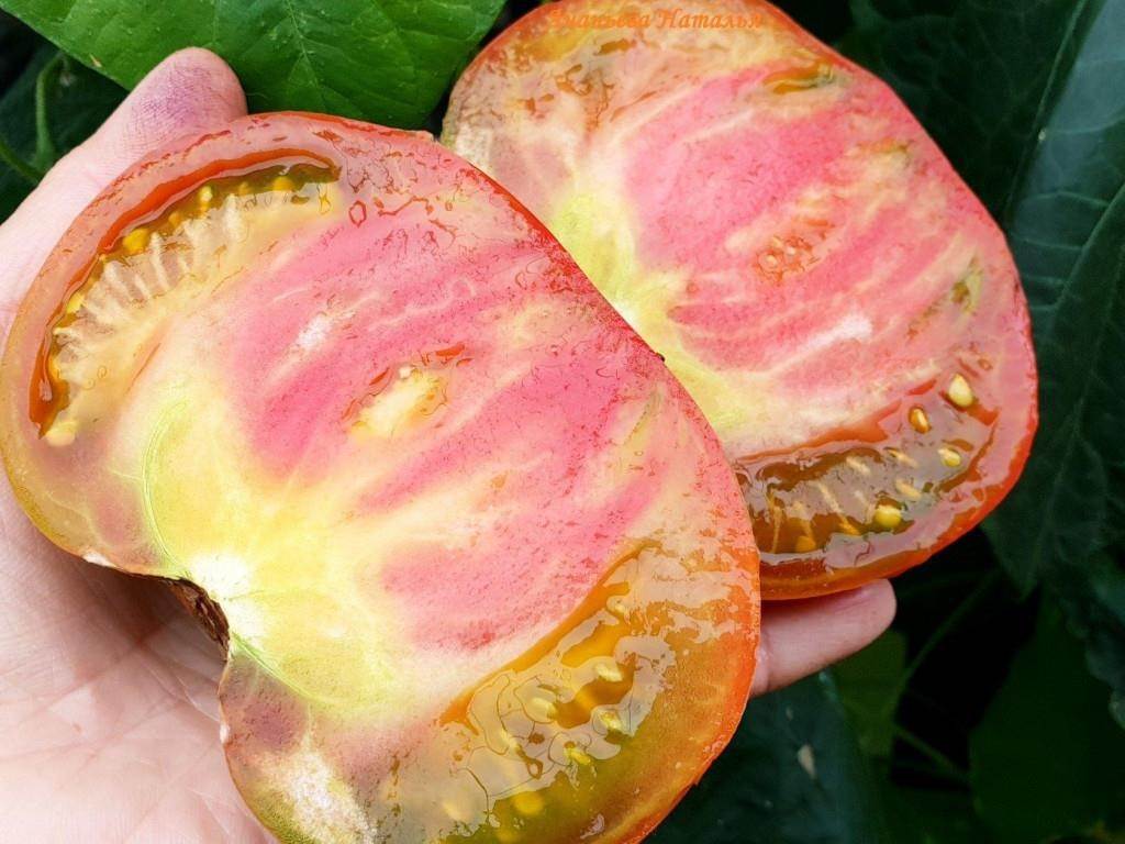 Это индетерминантный высокопродуктивный сорт, завязывающий множество ребристых приплюснутых плодов типа «бифштекс», мраморно-розового цвета. Срок созревания – средний. Вкус его более кислый и пряный, чем у большинства сортов, и он отлично подходит для салатов и консервирования.