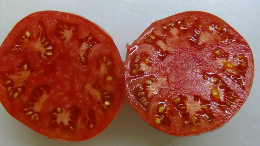 Плод мясистый: одна помидорная мякоть, умеренно сочная, с маленькими семенами, расположенными в небольших камерах. На вкус сахарный (сладкий даже при неблагоприятных погодных условиях). Масса плодов варьируется в пределах 300-500 грамм – на кистях, расположенных внизу, и 150-250 – на верхних.