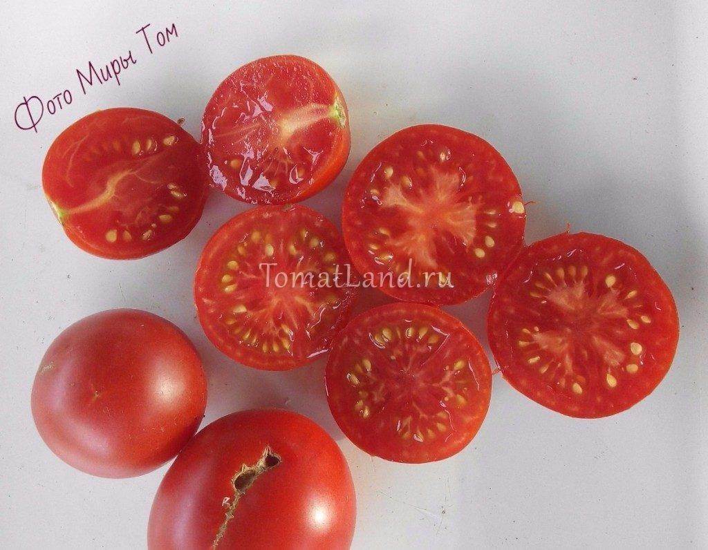 Описание пома: круглые, ярко-красного цвета, с гладкой кожицей. Внутри 4 камеры. Мякоть кисло-сладкая, ароматная и вкусная. Применяются для консервации и засолки, свежего потребления, использования в любых блюдах и приготовления томатопродуктов.