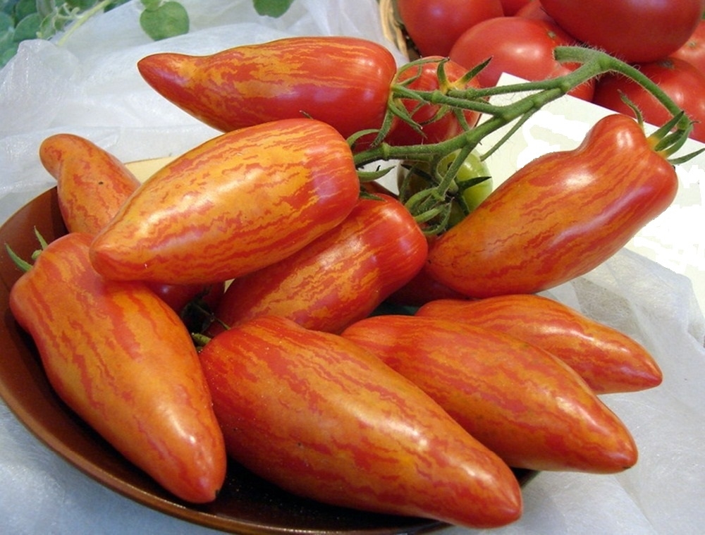 Согласно описанию, помидоры сорта Перцевидный полосатый (на фото) имеют необычную окраску и форму. Созревают в среднеранние сроки, за 3,5 месяца с момента прорастания семян. Создан томат для регионов рискованного земледелия, к условиям открытого грунта не адаптирован. В Сибири и Урале возможна культивация только закрытым способом.