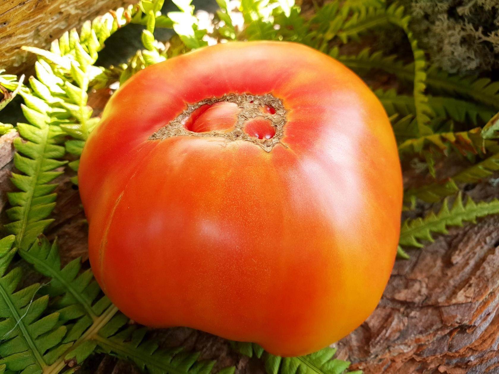 томат влаголюбивый, в жаркий сезон в мякоти образуются пустоты, а на поверхности появляются трещины.