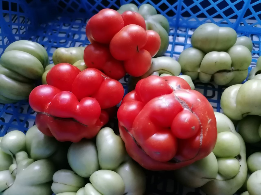 - плоды имеют сердцевидную, ребристую форму, их масса колеблется в пределах 200–500 г, но вырастают и томаты-гиганты, вес которых достигает 1 кг;