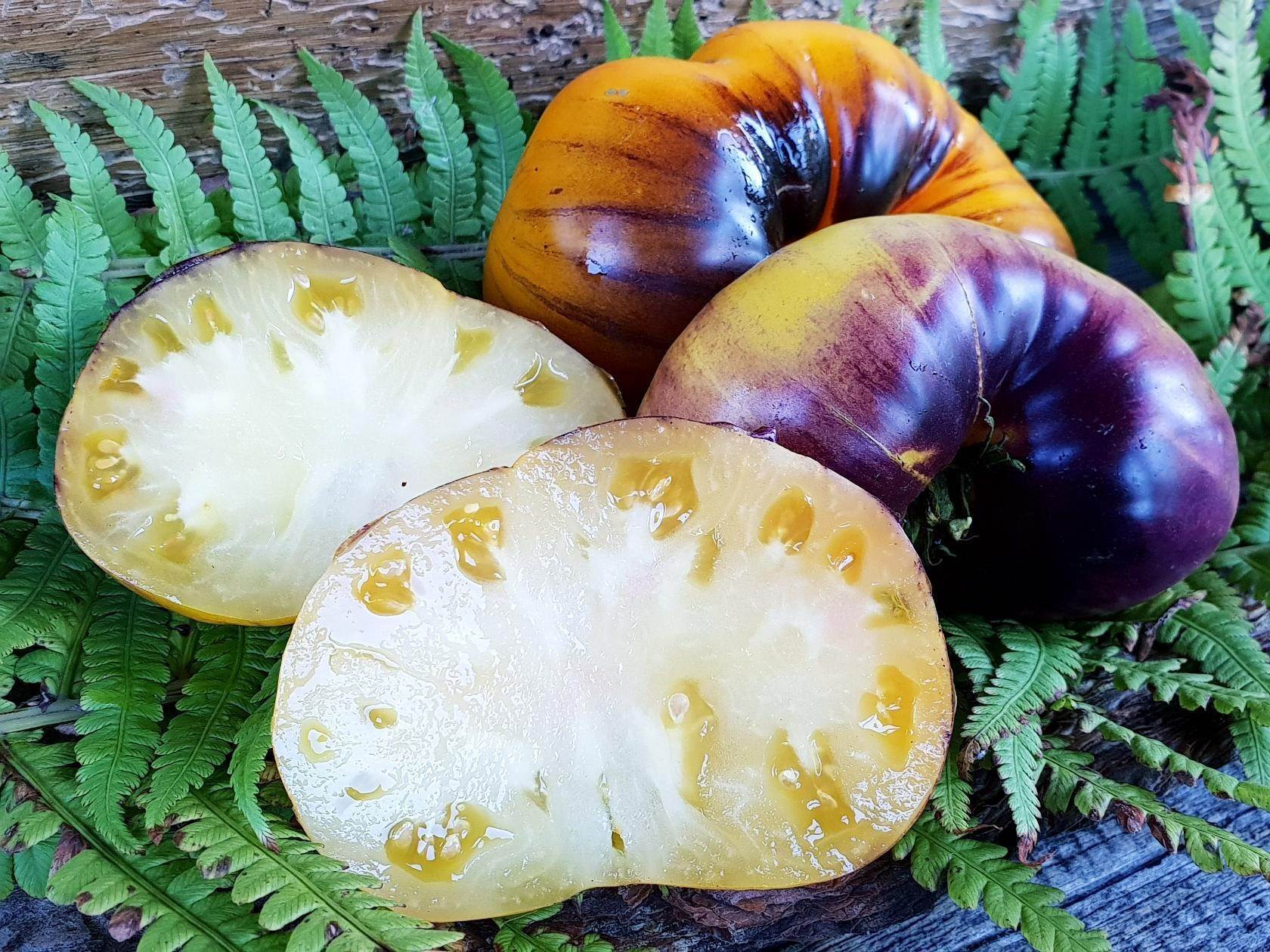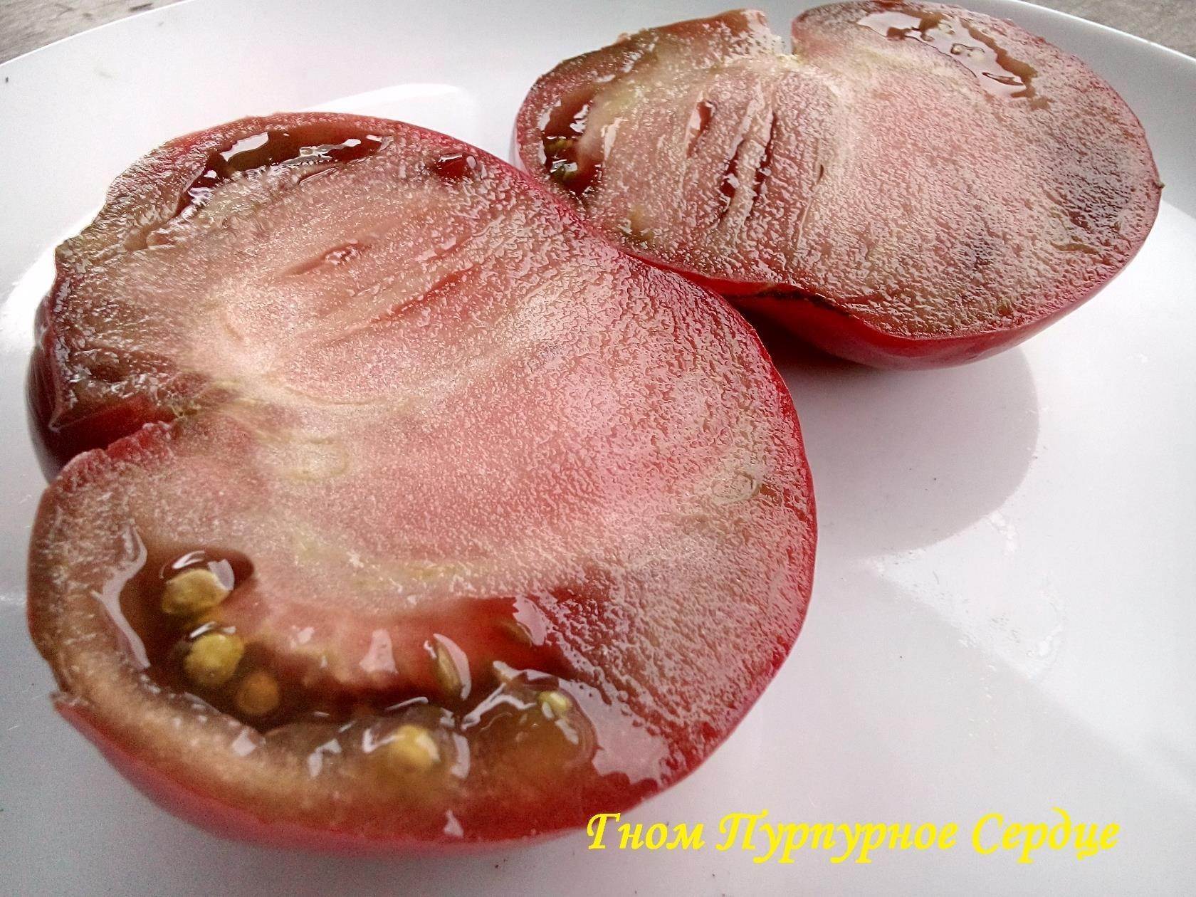 Мякоть томата Гном Фиолетовое сердце плотная, мясистая, словно маслянистая на вид. Она окрашена в красивый винный цвет. Вкус помидор оценивается очень высоко. Они сладкие, с присутствием легкой кислинки и фруктового послевкусия. Томаты обладают приятным освежающим ароматом.