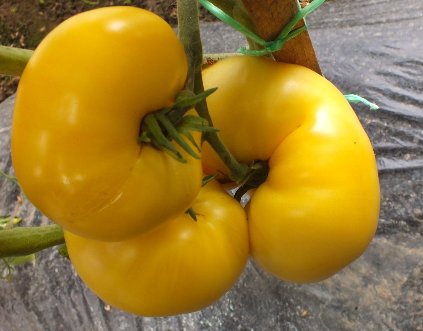 Сорт, плодоносящий красивыми золотистыми помидорами. Средний вес одного из них составляет 180…200 г. Помидоры очень вкусные, подходят для употребления в свежем виде и для консервирования. Форма плодов удлинённая книзу, округлая. Растение высокорослое, рекомендовано для выращивания в открытом грунте. Урожай снимают в средние сроки – через 105…110 дней после появления ростков.
