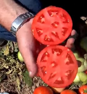 Первые созревшие помидоры имели вес порядка 200-250 грамм. Они отличались плотной, мясистой консистенцией, сочной мякотью и тонкой кожицей ярко-красного цвета.