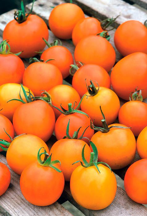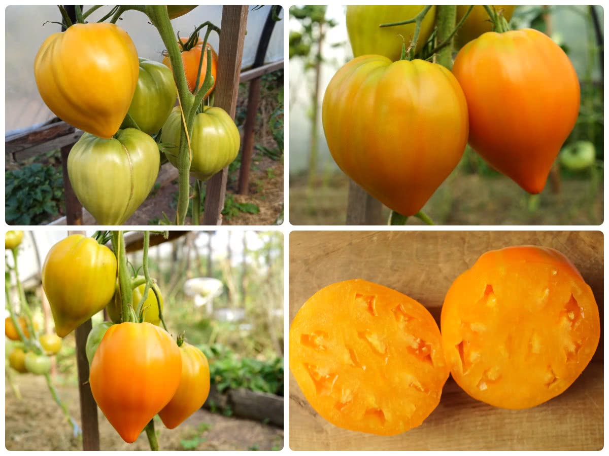 Это среднеспелые растения, отличающиеся мощным ростом и высотой около двух метров. Их плоды имели привлекательный желто-оранжевый оттенок, слегка ребристую поверхность, вытянутую форму с заостренным кончиком. Кисти получались довольно тяжелыми из-за крупного размера самих томатов, но при этом не слишком длинными. Благодаря этому плоды как бы «ложились» на стебель, их не требовалось специально подвязывать.