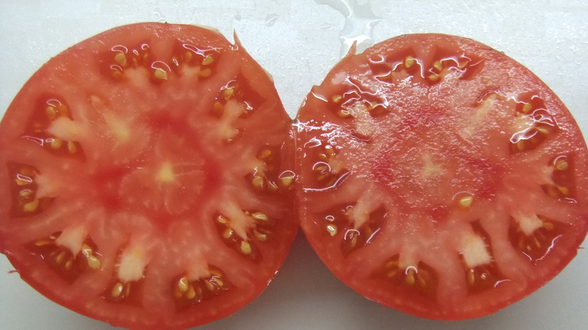 Зрелые помидоры отличаются розовым окрасом. Чем выше вес, тем больше наблюдается пустот внутри плода. Мякоть нежная и плотная, имеет сахаристую структуру и слегка красноватую окраску. При разрезании выделяется незначительное количество сока.
