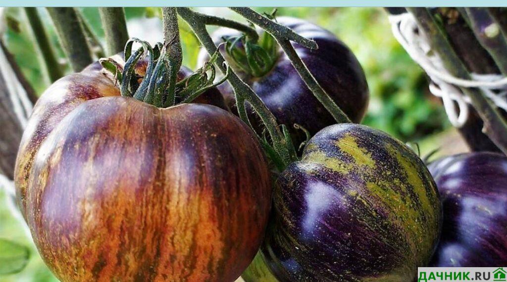 Окраска кожицы уникальна: на бордово-малиновом фоне (или тёмно-вишнёвом, зависит от количества солнышка) чёрные и чернильные полоски, штрихи, схожие с молниями. Отличные вкусовые характеристики – баланс кислоты и сладости, чувствуются терпкие оттенки, мякоть сочная, мясистая, мармеладная (по отзывам!), с выраженным помидорный ароматом. Сорт достаточно устойчив к болезням и имеет хорошую урожайность. Применяют как украшение любого блюда, так и в зимних заготовках.