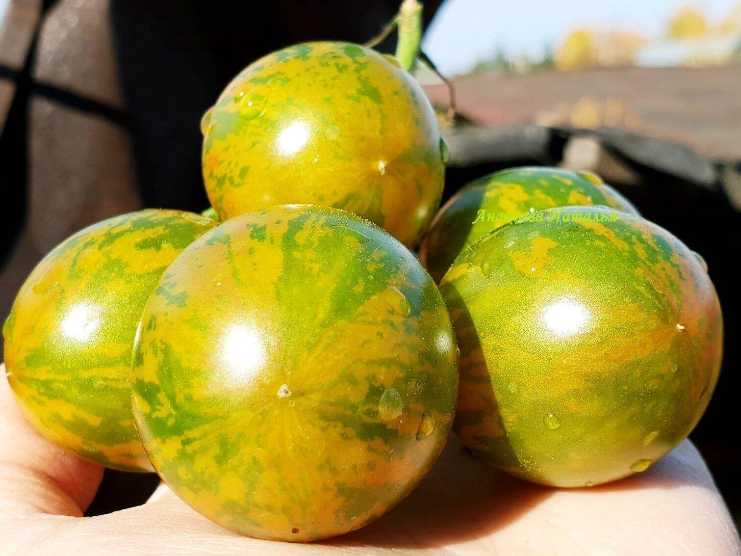 Зрелые помидоры окрашены в салатовый цвет с желтоватым оттенком и весят всего 30-40 граммов. При этом такие плоды находятся в нижней части кустов. Сверху чаще всего формируются более мелкие помидоры. Сорт обладает неплохими вкусовыми качествами, из-за чего его часто используют во время приготовления консерваций.