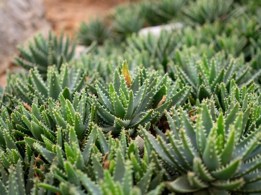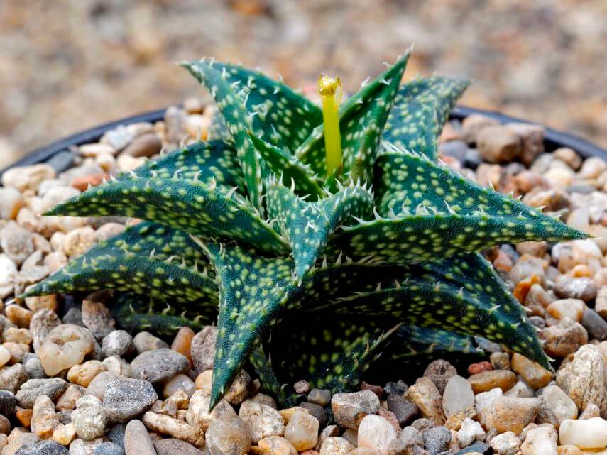 Алоэ Дескоингса (Дескуана) — растение с прикорневой розеткой. Это карликовый почвопокровный сорт с короткими треугольными листьями в точку. Край листа у него зубчатый, цветки оранжевого цвета. Растет очень медленно, любит тесные горшки (всего 7-9 см).