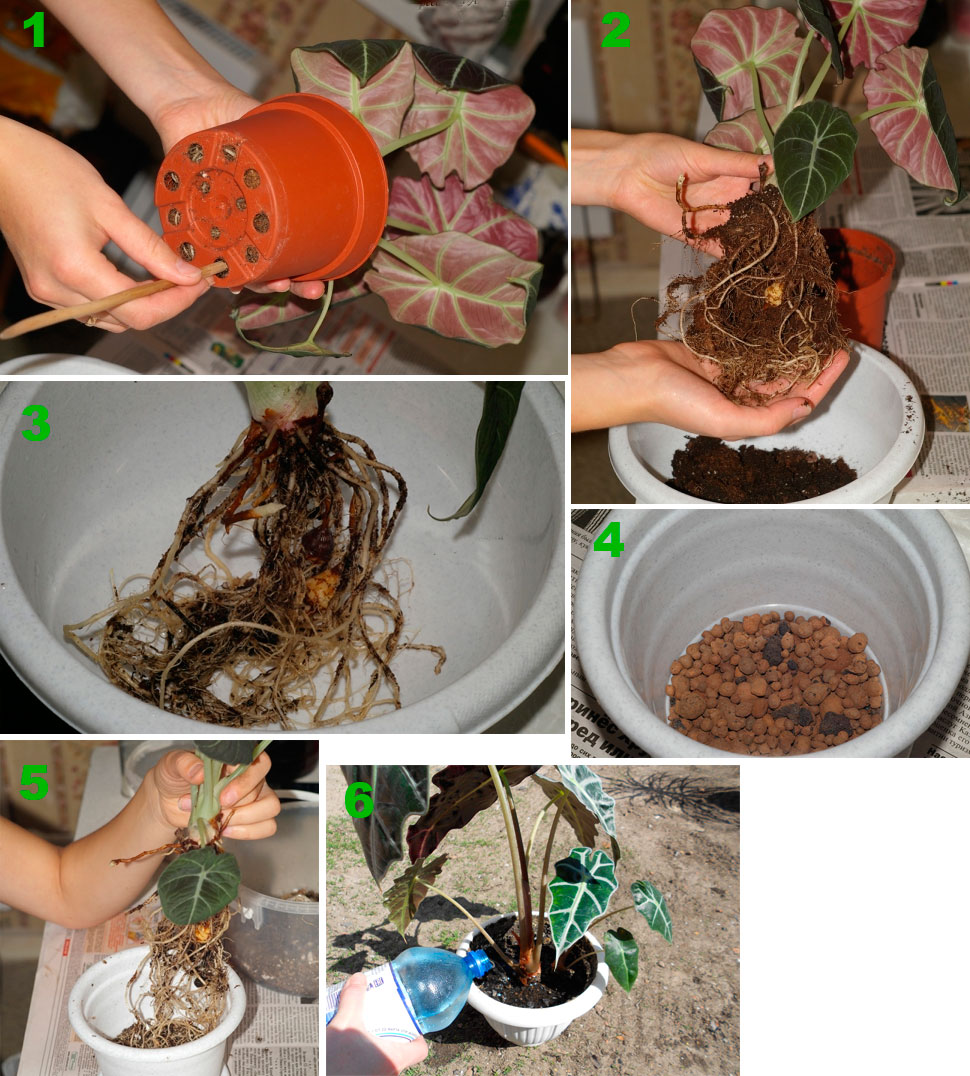 Молодые растения пересаживают каждый год весной, взрослые растения один раз в 2-3 года. Необходимо обеспечить хороший дренажный слой для лучшего вывода излишков воды. Для взрослой алоказии пересадку осуществляют методом перевалки. Если планируется деление куста, то корневище освобождают от земляного кома. Выбирают новый цветочный горшок выше предыдущего и больший по диаметру. О необходимости пересадки цветка сигнализируют корни, торчащие из дренажных отверстий цветочного горшка. В этом случае корни полностью заполняют все пространство ёмкости, растению становится в нем тесно.