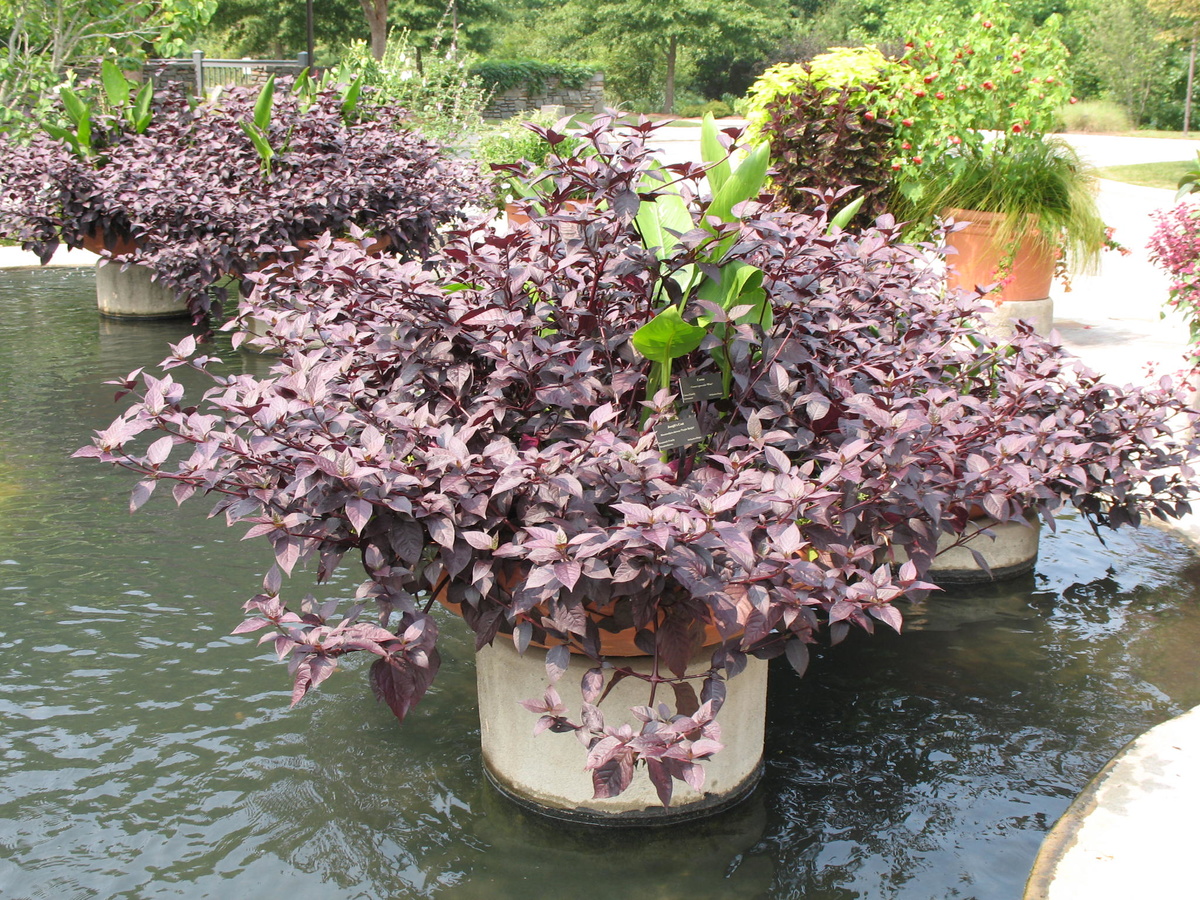 Очень привлекательное длинностебельное растение, листья которого имеют окраску от розово-красной до темно-лиловой. Его плети, стелющиеся по поверхности воды, могут достигать значительной длины. Альтернантеру лучше всего высаживать на боковые полочки аквариума с высоким колпаком, причем осветители должны находиться на большом расстоянии от поверхности воды. Сажают растение так, чтобы его верхушки находились у поверхности воды. Разрастающиеся плети поднимаются над водой, а по мере роста погружаются в нее под собственной тяжестью. Альтернантера растет в аквариуме в течение всего года. Полностью погруженная в воду, она развивается очень медленно. У аквариумистов этот вид альтернантеры популярен несколько меньше, чем другие.
