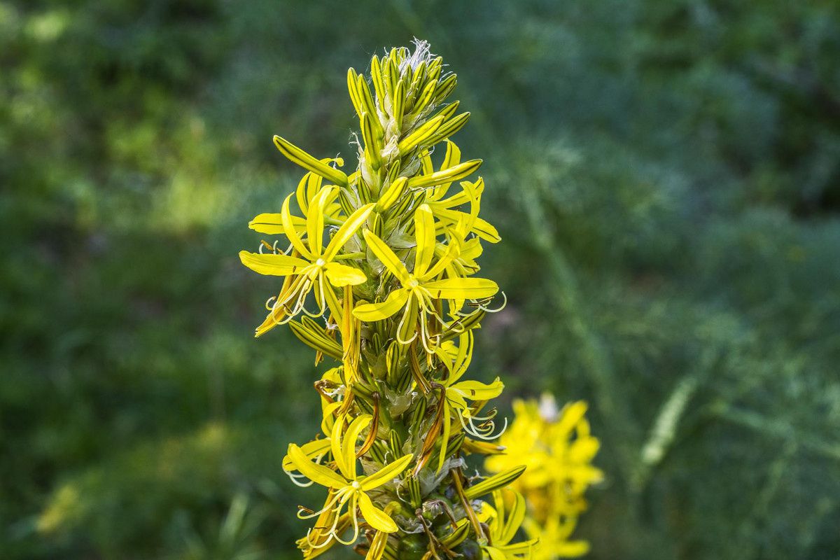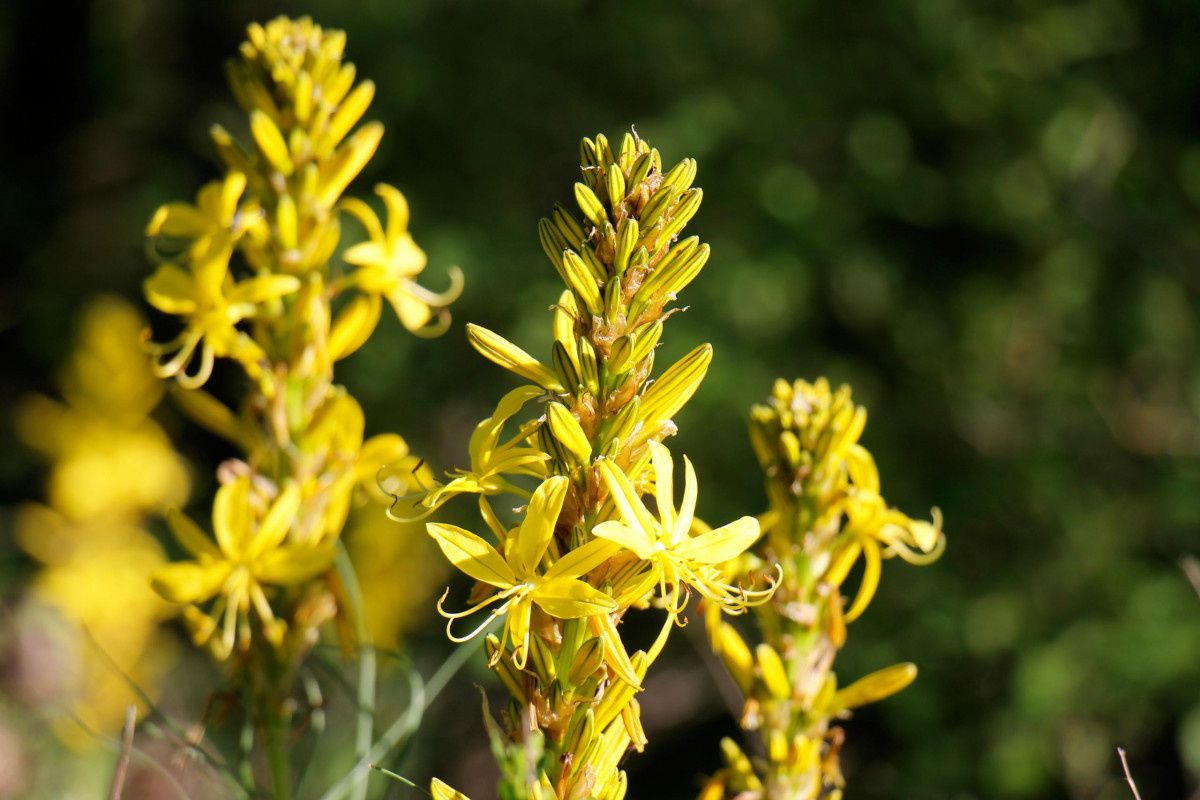 - Асфоделина желтая (Asphodeline lutea) встречается под названием Asphodelus luteus. В природе предпочитает селиться на горных каменистых склонах, при этом может расти на высоте до 1 км над уровнем моря, но также встречается на лесных опушках или в кустарниковых зарослях, очень редкий гость в степных районах. Все территории произрастания охватывают средиземноморские крымские области, юго-восточные земли Европы, Малую и Переднюю Азию, и север африканского континента. По высоте стебли этого вида смогут достигать 60-ти см. Они хорошо облиственные, при этом форма листвы шиловидная. Длина листовой пластины составляет 10–15 см при ширине около 8 мм. По кромке имеется короткое опушение. В густое кистевидное соцветие собираются цветочки желтого или зеленовато-желтого колера, в поперечнике не превышающие 3–4 см. Процесс цветения приходится на май. Довольно морозостойкое растение. Имеется садовая форма с цветами, имеющими махровую структуру — Asphodeline lutea f. flore pleno.