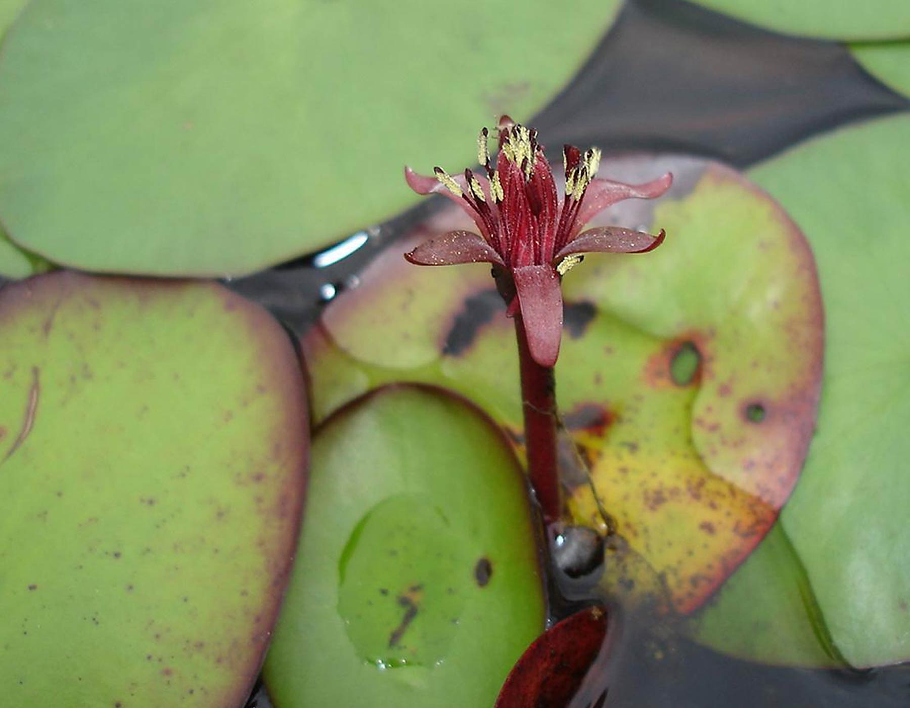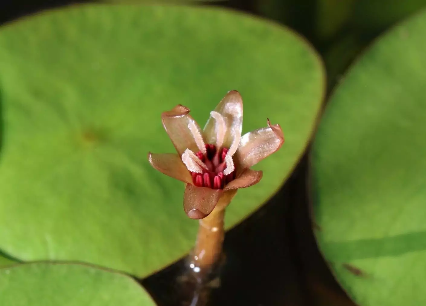 Цветки одиночные, расположены на длинных красных цветоносах. Стебли цветков при цветении прямые, держат цветки на 5-10 сантиметров над поверхностью воды. Околоцветник при цветении скручивается наружу и вниз, позже становится вертикальным. Чашелистиков 3 или, реже, 4, длиной 13-15 миллиметров, в форме ремешка.