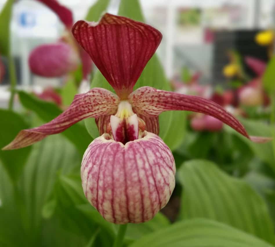 Венерин башмачок надутый (C ventricosum) – природный гибрид башмачков крупноцветковых и настоящего. Цвет варьируется от лавандового до пурпурно-коричневого. Губа крупная, удлиненная, с полосатым сетчатым рисунком, боковые лопасти простые, удлиненные, по краю слегка волнистые.