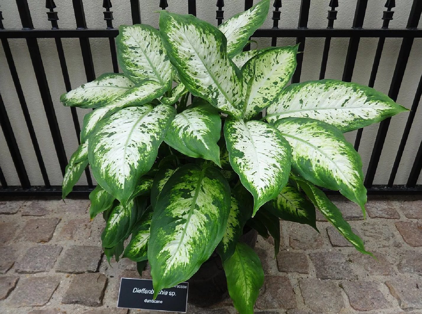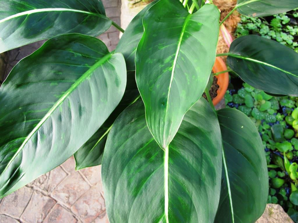 Диффенбахия пятнистая (она же Дифенбахия раскрашенная, она же Dieffenbachia maculata или Dieffenbachia picta). Стебли и листовые пластинки — крупные, листовая пластинка может достигать 40-50 см в длину и 10-12 в ширину, может быть вытянутой формы или ланцетной (сузившейся кверху, заостренной). На поверхности листа могут находиться около пятнадцати боковых жилок. Диффенбахия пятнистая цветет початком, образует оранжево-красные ягоды.