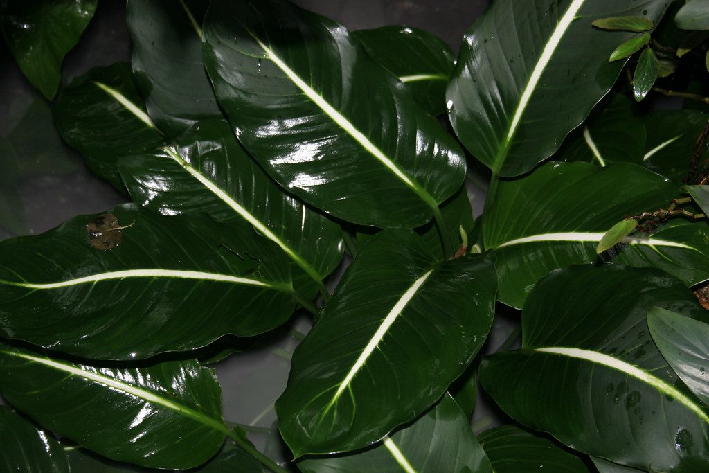 Диффенбахия Эрстеда (Oerstedii). Её легко отличить по рисунку на больших темно-зеленых листьях. Белая жилка проходит по его центру, а стороны от неё идут тонкие белые боковые прожилки.