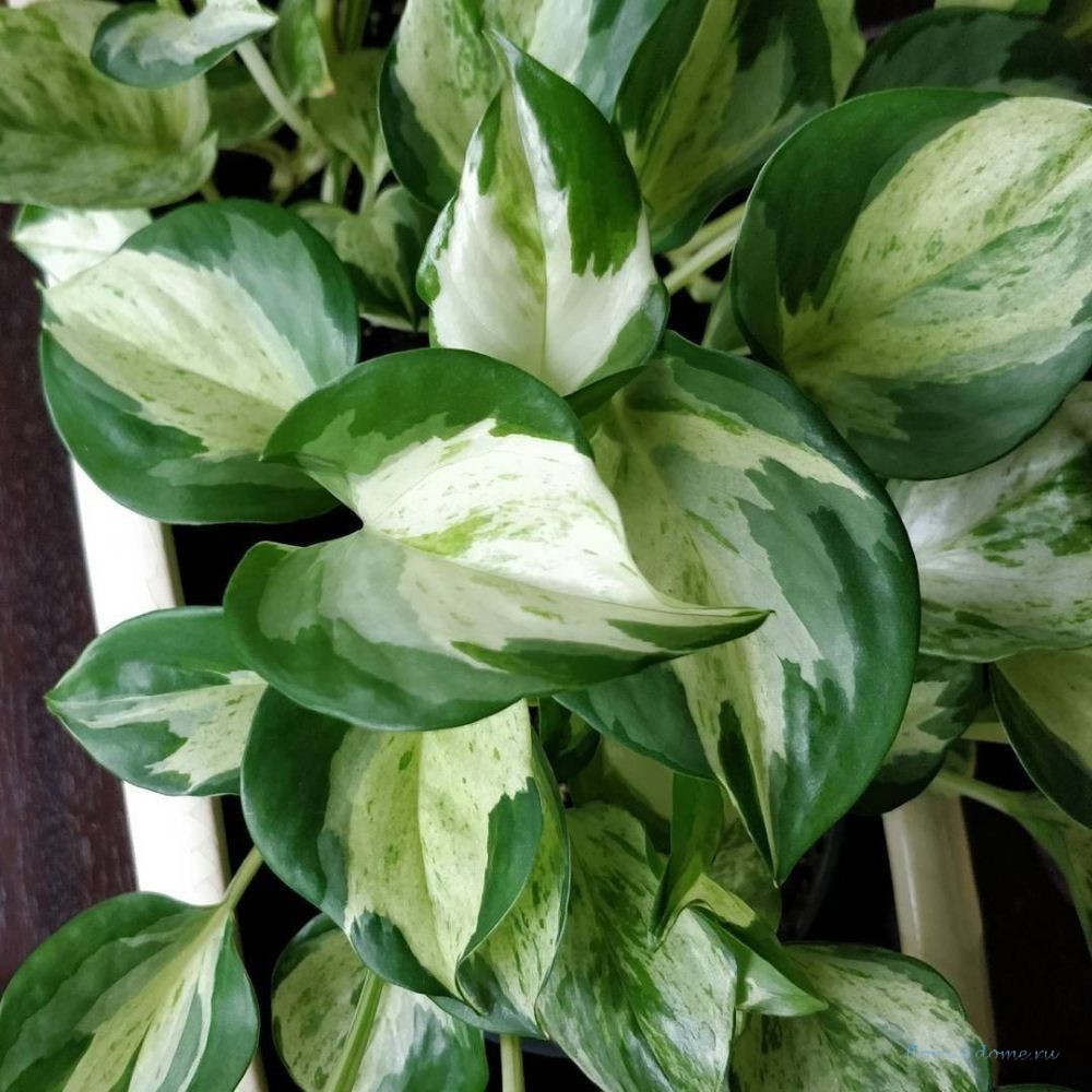- Рассматривая золотистый вид эпипремнума, нельзя не упомянуть о сорте Жемчуг и нефрит (на лат. полное название Epipremnum aureum «Pearls and Jade»). Этот сорт был выведен из Мраморной королевы американскими цветоводами. Его отличительной особенностью выступают компактные габариты, которые несвойственны другим декоративным представителям рода эпипремнум. У зрелого растения размер листьев в длину достигает 8 см, а в ширину 5 см. Окрас пятнистый, состоящий из зеленого, белого и серо-зеленого оттенка. Двух одинаковых по цвету листьев на одном растении практически не встретить, но это ни в коем случае не минус, а даже наоборот ― смотрятся лианы сорта Жемчуг и нефрит очень оригинально. При этом сами листья не гладкие, как у большинства других эпипремнумов, а отличаются бугристой поверхностью. Стебель растения преимущественно зеленого цвета с белыми продольными полосками. Черешки длинные и практически равны листьям, которые на них крепятся. Особую популярность этому сорту снискал не только эффектный внешний вид, но и неприхотливость к условиям выращивания. Единственное, в чем остро нуждается растение ― это достаточная освещенность, без которой привлекательный облик может потускнеть.