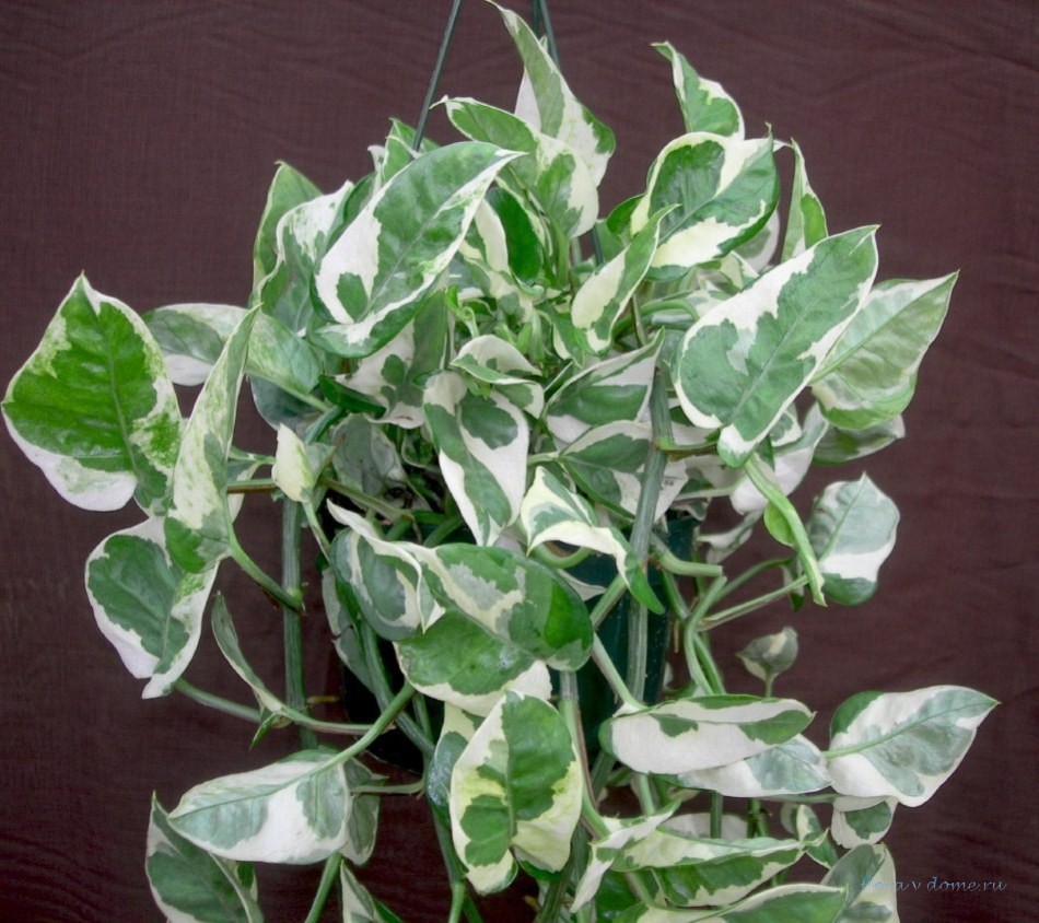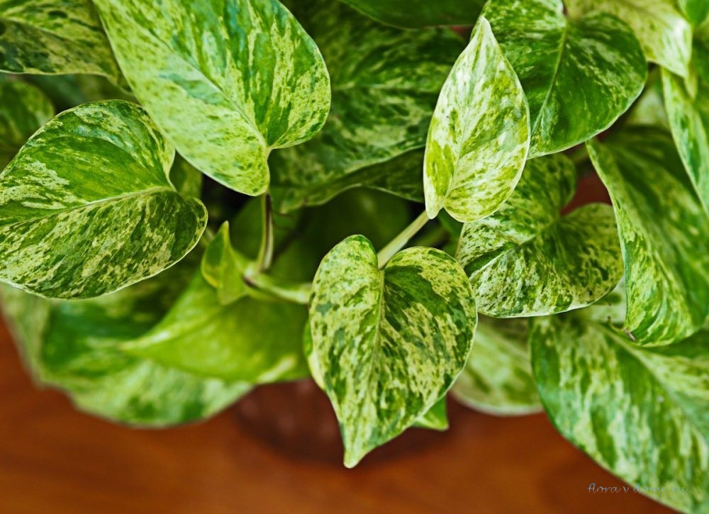 Представляет собой вьющуюся лиану, украшенную мраморными листовыми пластинами с желто-зеленым окрасом и очень длинными побегами. Стебли вырастают до 2-х метров длины. Практически никогда не цветет. Сорта: Ауреум и Марбл Квинт.