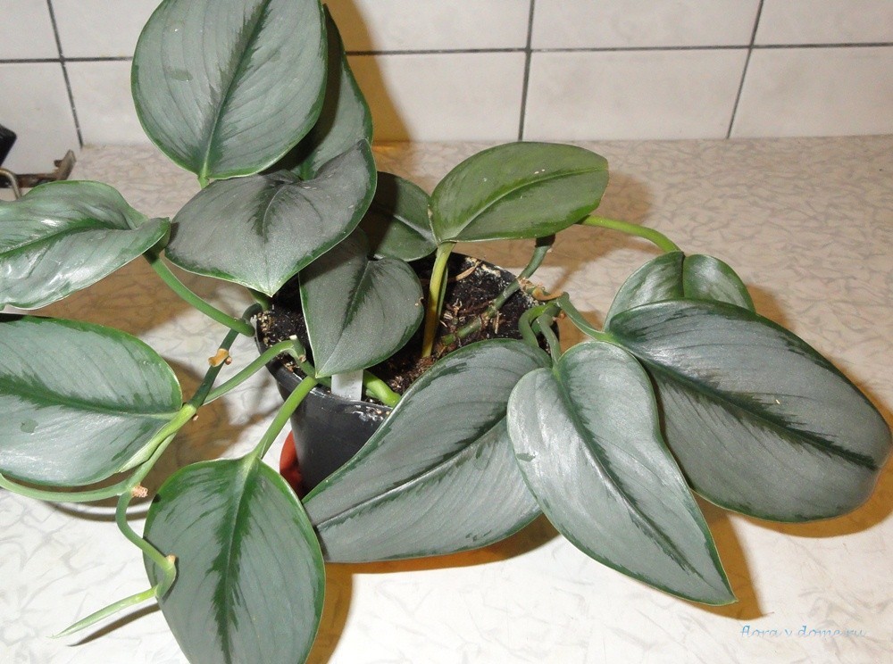 Крупные, до 10 см листья на длинных черешках. Цвет листьев – яркий светящийся салатово-зелёный. В домашних условиях может вырасти до 5 метров, поэтому требует опоры или постоянной обрезки.