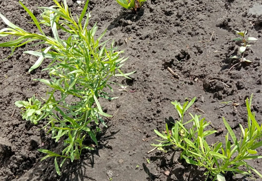 - Уход за растениями в открытом грунте. После появления молодых кустов прореживаем грядку таким образом, чтобы между травой сохранилось расстояние 30 см. Периодически удаляем сорняки, эстрагон не любит соседство с другими растениями.