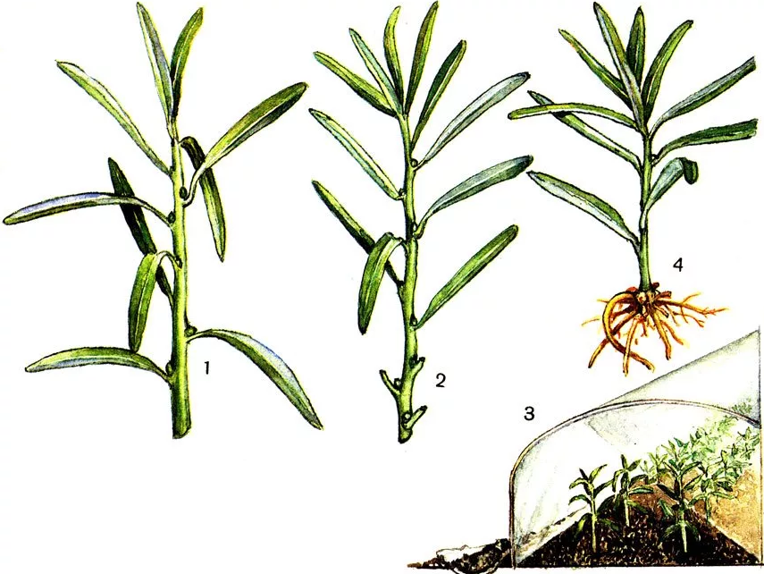 Черенкование – весьма простой, эффективный способ размножения тархуна. Заготавливают черенки в апреле, мае. В качестве черенка выбирают здоровый побег приблизительно 15 см длины. Срезают ветвь под острым углом, без зазубрин. Заготовленный побег обрабатывают раствором для интенсивного роста корневища, погружают в контейнер. В течение месяца побег укореняется. Хорошо развитый куст пересаживают на основное место роста.та.