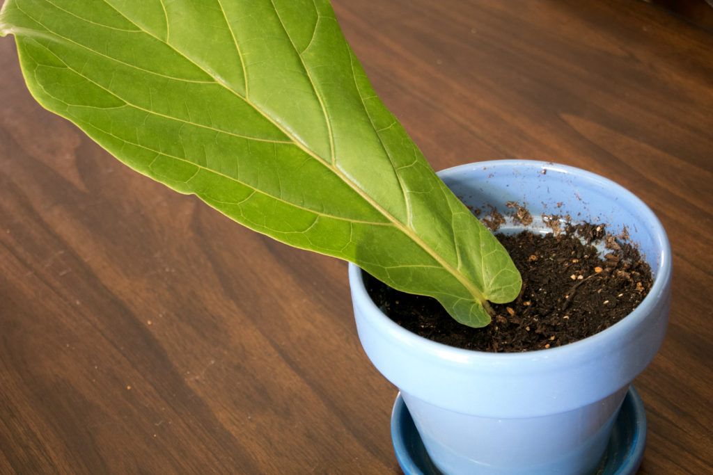 Как только у черенка появятся новые ростки, указывающие на успешное укоренение, пакет нужно убрать и поливать растение, чтобы почва у него была влажной. Примерно через четыре месяца, когда черенок разовьёт хорошую корневую систему, его пересаживают в горшок на один размер больше со стандартной почвой на основе торфа, после чего ухаживают за молодым растением как за взрослым Фикусом.