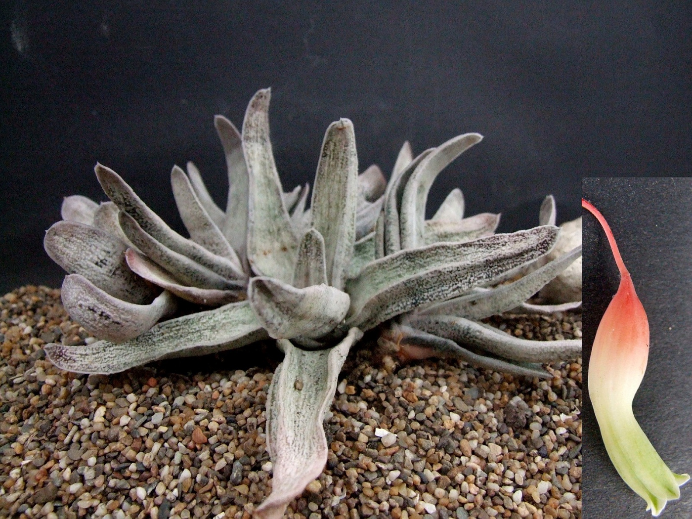 Гастерия беловатая — бесстебельная разновидность с интенсивно-зелёными широкими листьями мечевидной формы, длина которых не превышает 30 см, а ширина – 7 см. Насыщенно-красные цветки до 5 см образуют кистевидное соцветие, расположенное на длинной стрелке в 1 м.