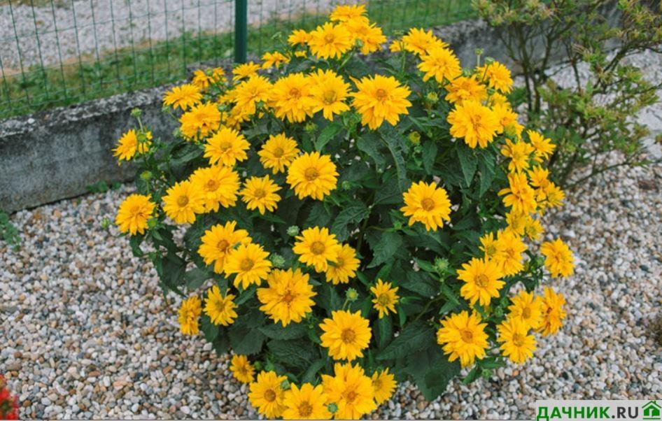 - Подсолнечниковый. Это растение можно распознать по ярко-желтым цветам, буквально покрывающим куст. Строение соцветия может быть как махровым, так и полумахровым, а также встречаются и обычные, гладкие разновидности. Цветет эта культура практически всё лето.