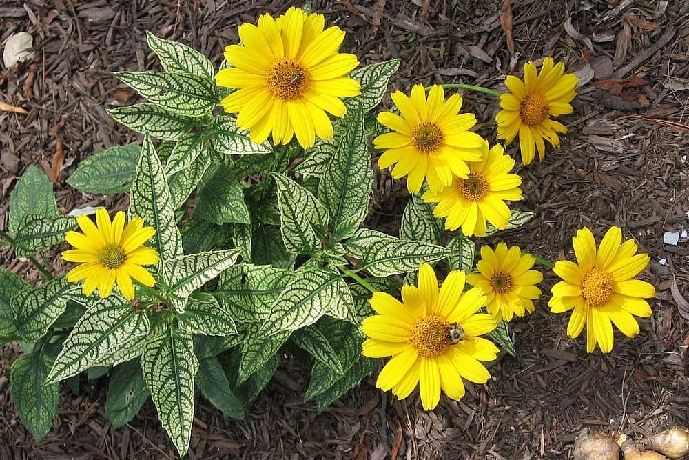 - Уинтер Сан, или гелиопсис Лорейн Саншайн – компактный куст высотой до 90 см с серебристо-серыми листьями в темно-зеленых прожилках и желтыми ромашками соцветий;