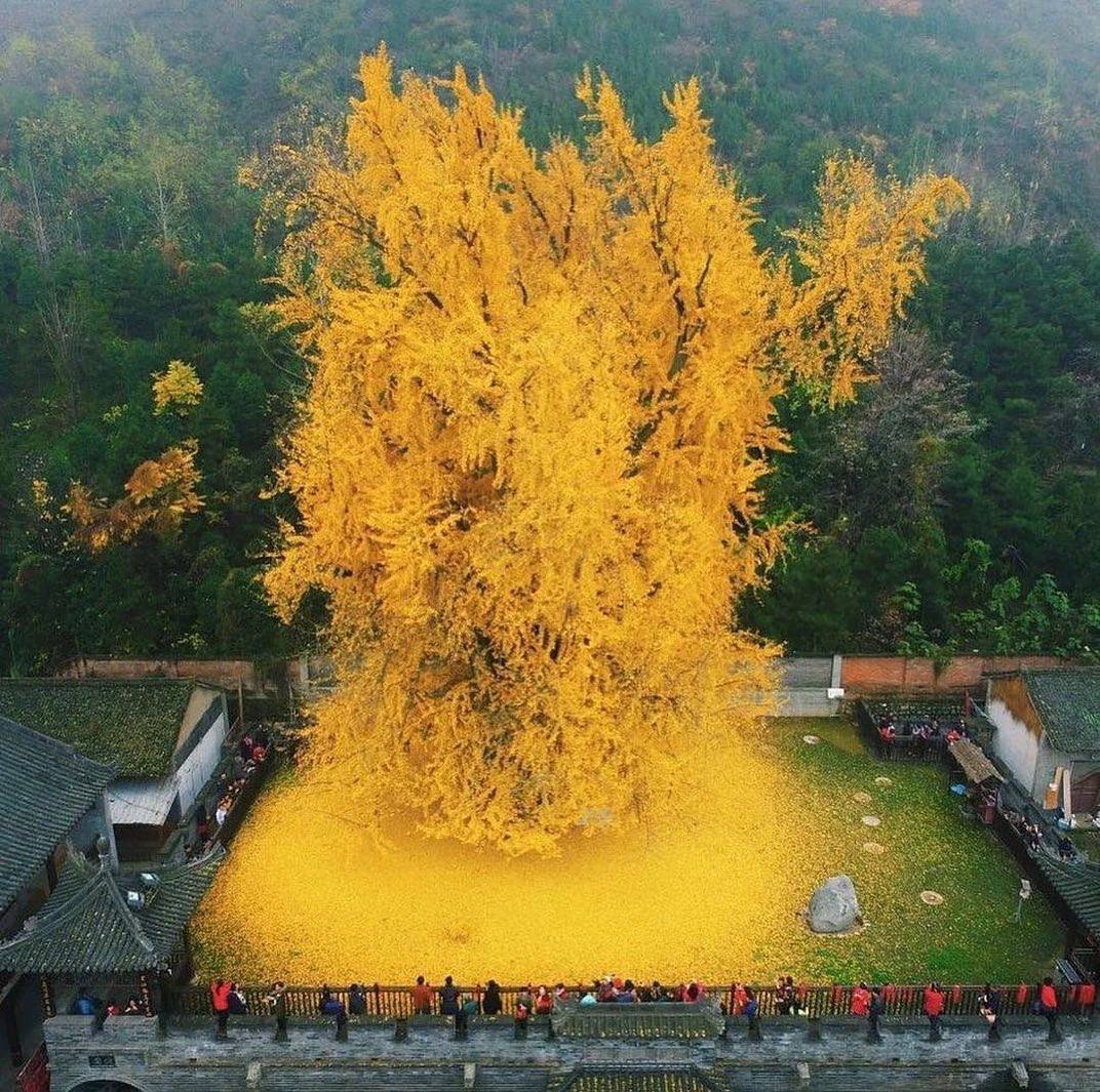В Китае на территории Гуаньинского буддийского храма растет Гинкго билоба (местные называют его “Золотое дерево”). Ему уже более 1400 лет, но его красота ничуть не угасла.