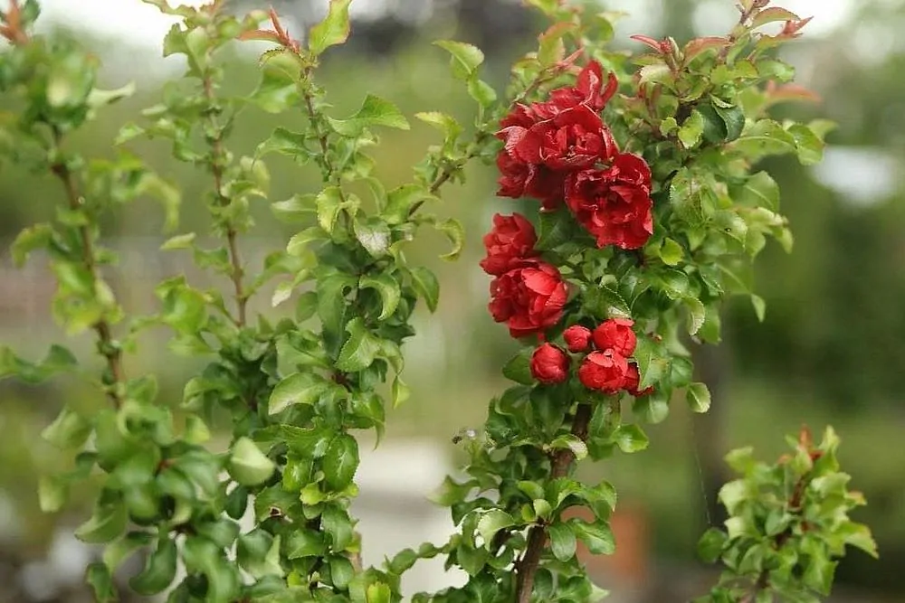 Красно-коричневые изогнутые побеги и яркая листва делают кустарник невероятно привлекательным. Размер его не превышает метровой отметки, что переводит хеномелес в разряд декоративных.
