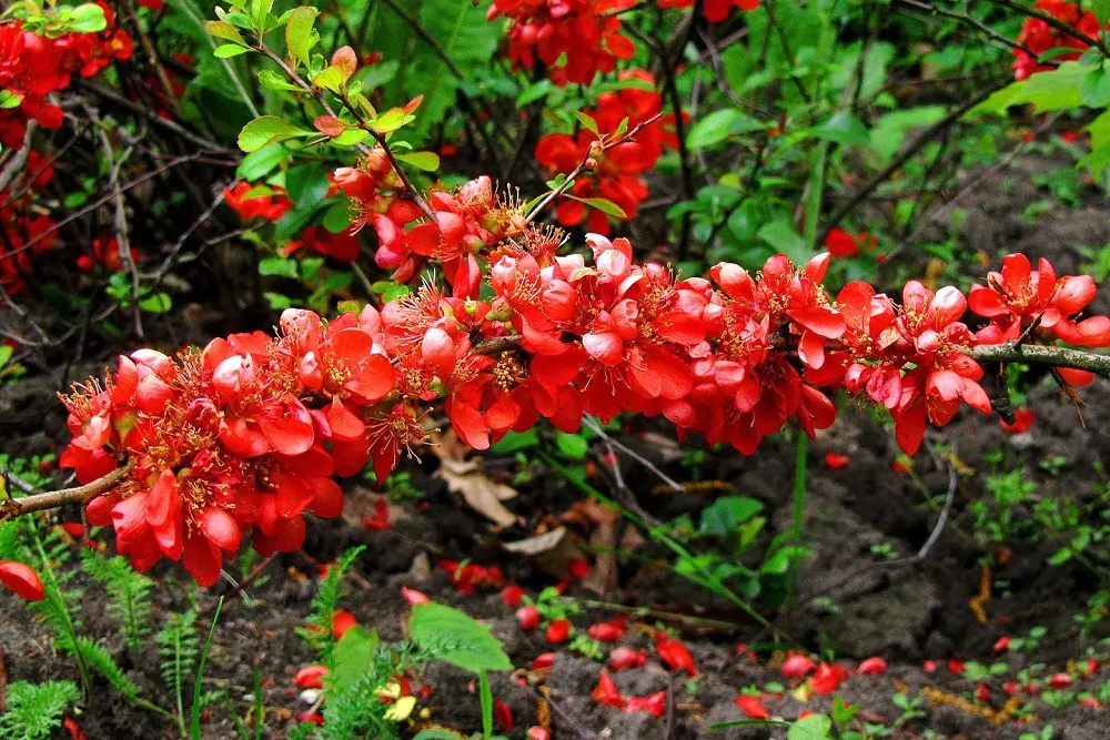 Популярный и эффектный сорт айвы великолепной «Скарлет Шторм» с крупными махровыми ярко-красными цветами, похожими на розы.