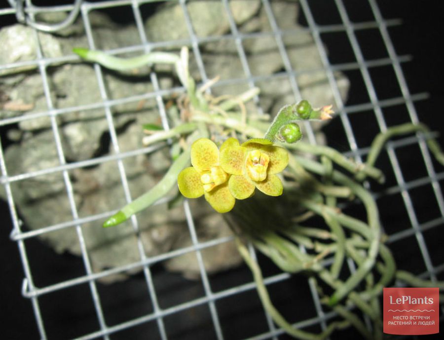 Пвевдобульб у растения нет. Крошечный стебель растет вверх, набирая каждый год лишь несколько миллиметров. Миниатюрная орхидея преображается в период цветения. Длинные по сравнению с побегом и корнями, поникающие, иногда ветвящиеся цветоносы несут десятки бутонов. Мелкие цветки (белые, желтые, зеленоватые, красные, коричневые) приятно пахнут. У каждого вида свой собственный аромат: мед, ваниль, карамель, цитрус, мимоза.