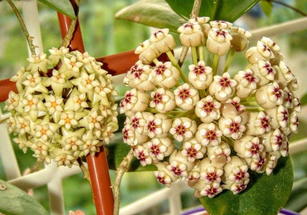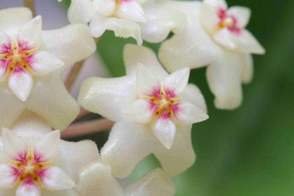 Цветки хойи карнозы с толстыми нежно-розовыми венчиками, такого же цвета коронками и винно-красными верхушками пыльников; в соцветии до 20 цветков.